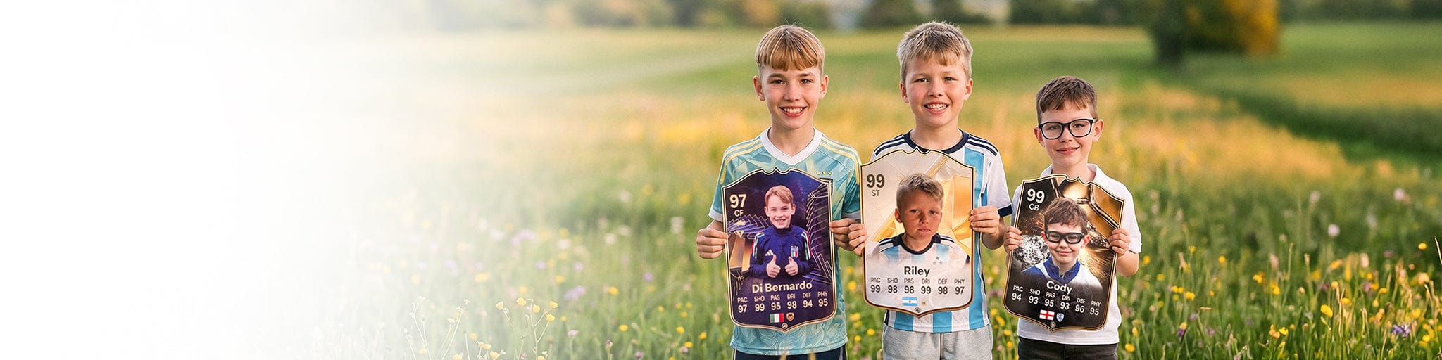 When it comes to personalising your card, the basic steps are to upload a photo and add a name to your card. Then you’ll add details like your player’s position and skill ratings out of 99 for each football skill shown on the card. Our online card builder makes this really easy. And if you aren’t a football card expert, don’t worry!