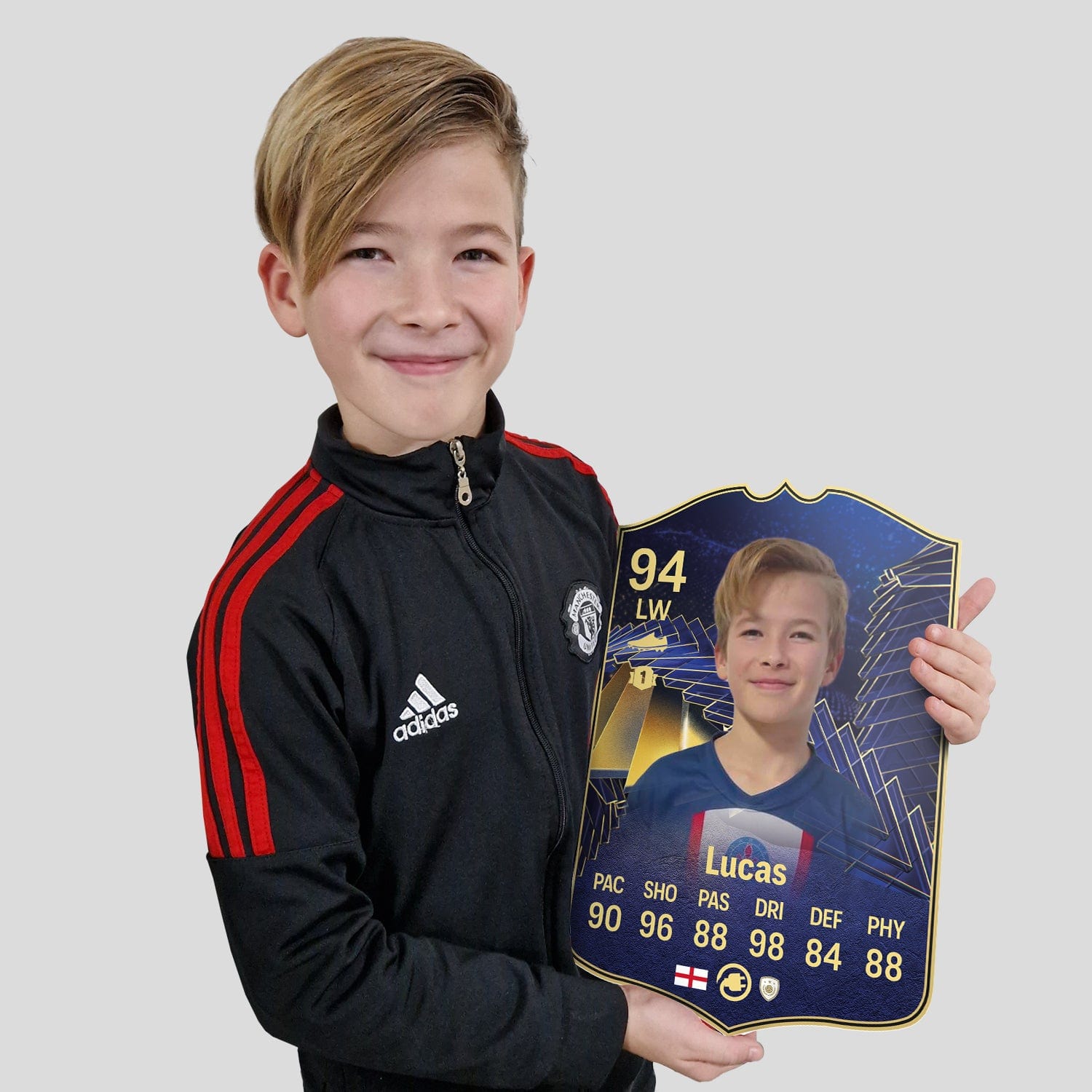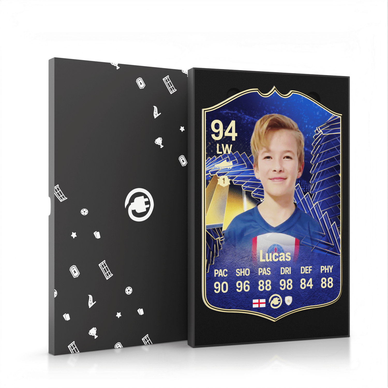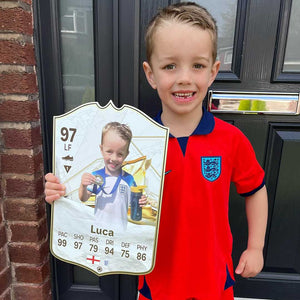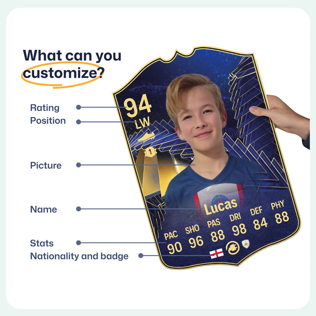 When it comes to personalising your card, the basic steps are to upload a photo and add a name to your card. Then you’ll add details like your player’s position and skill ratings out of 99 for each football skill shown on the card. Our online card builder makes this really easy. And if you aren’t a football card expert, don’t worry!