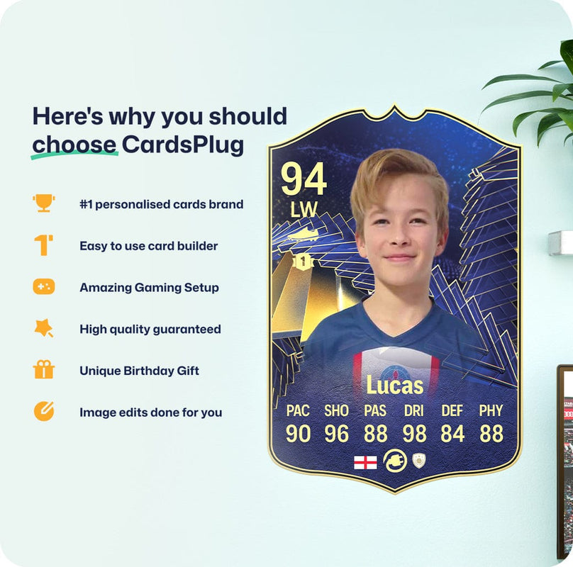 CardsPlug is home to the world’s favourite personalised football cards. Our easy football card builder lets you make a real life football card with your own name, photo, and skill ratings. With 100+ designs to choose from and some inspired by EA SPORTS FC 26 cards seen in EA FC 26, EA FC 25 and FC 24 as well as FIFA cards seen in games like FIFA 23 and FIFA 22.