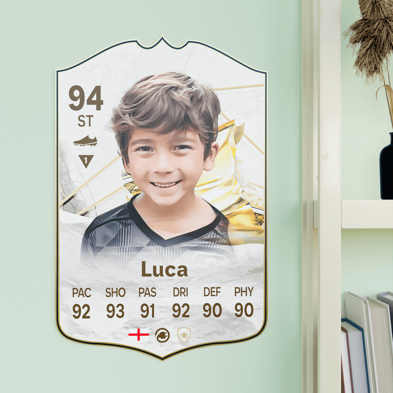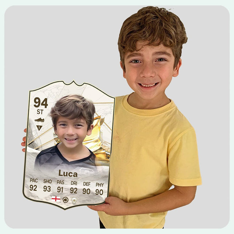 When it comes to personalising your card, the basic steps are to upload a photo and add a name to your card. Then you’ll add details like your player’s position and skill ratings out of 99 for each football skill shown on the card. Our online card builder makes this really easy. And if you aren’t a football card expert, don’t worry!