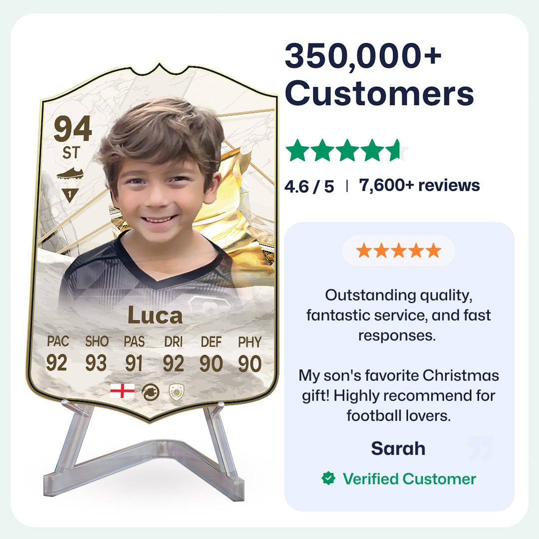 Once you’ve personalised your card, our design experts will edit your photo, design your card, and bring it to life in stunning quality. You’ll get a full preview before we print your card and every card’s quality is backed by our Gold Standard Guarantee. So far, over 350,000+ football fans agree: A CardsPlug football card is the ultimate football gift!