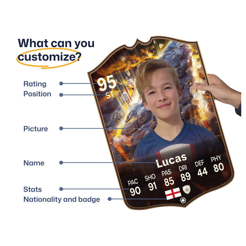 When it comes to personalising your card, the basic steps are to upload a photo and add a name to your card. Then you’ll add details like your player’s position and skill ratings out of 99 for each football skill shown on the card. Our online card builder makes this really easy. And if you aren’t a football card expert, don’t worry!