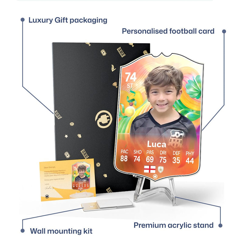 When it comes to personalising your card, the basic steps are to upload a photo and add a name to your card. Then you’ll add details like your player’s position and skill ratings out of 99 for each football skill shown on the card. Our online card builder makes this really easy. And if you aren’t a football card expert, don’t worry!