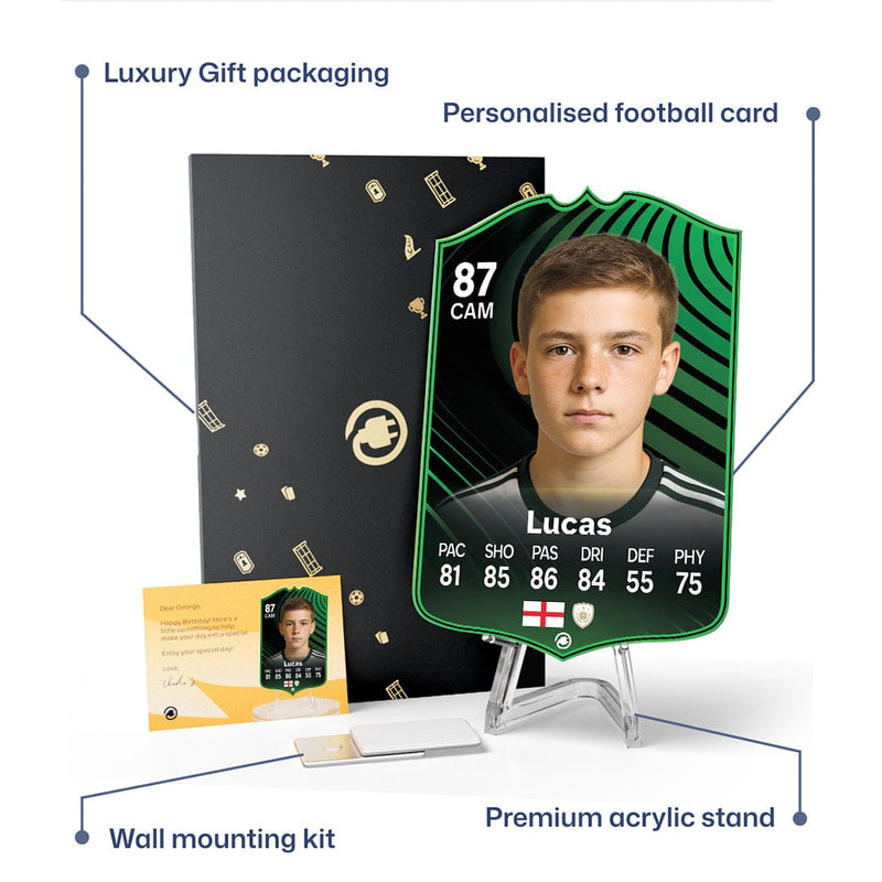 When it comes to personalising your card, the basic steps are to upload a photo and add a name to your card. Then you’ll add details like your player’s position and skill ratings out of 99 for each football skill shown on the card. Our online card builder makes this really easy. And if you aren’t a football card expert, don’t worry!