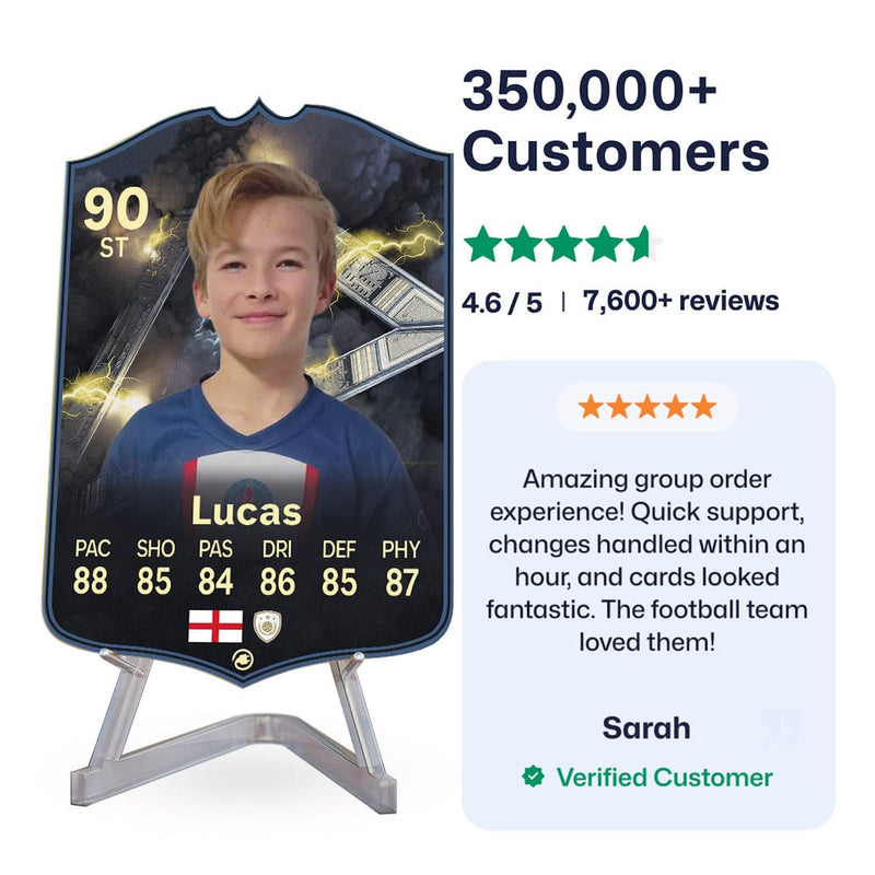 Once you’ve personalised your card, our design experts will edit your photo, design your card, and bring it to life in stunning quality. You’ll get a full preview before we print your card and every card’s quality is backed by our Gold Standard Guarantee. So far, over 350,000+ football fans agree: A CardsPlug football card is the ultimate football gift!