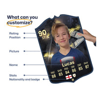 When it comes to personalising your card, the basic steps are to upload a photo and add a name to your card. Then you’ll add details like your player’s position and skill ratings out of 99 for each football skill shown on the card. Our online card builder makes this really easy. And if you aren’t a football card expert, don’t worry!