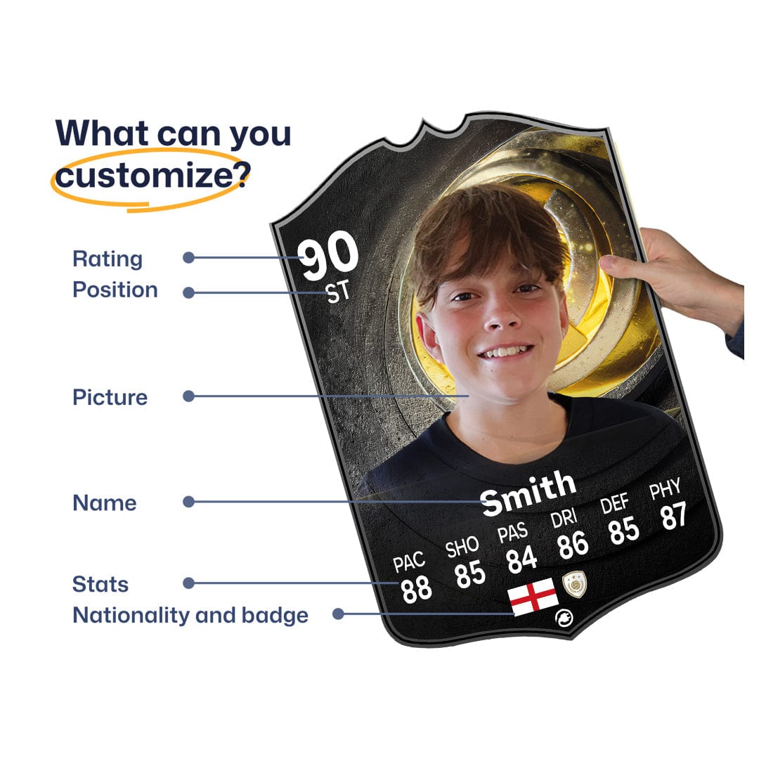 When it comes to personalising your card, the basic steps are to upload a photo and add a name to your card. Then you’ll add details like your player’s position and skill ratings out of 99 for each football skill shown on the card. Our online card builder makes this really easy. And if you aren’t a football card expert, don’t worry!