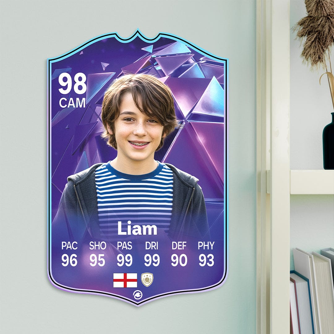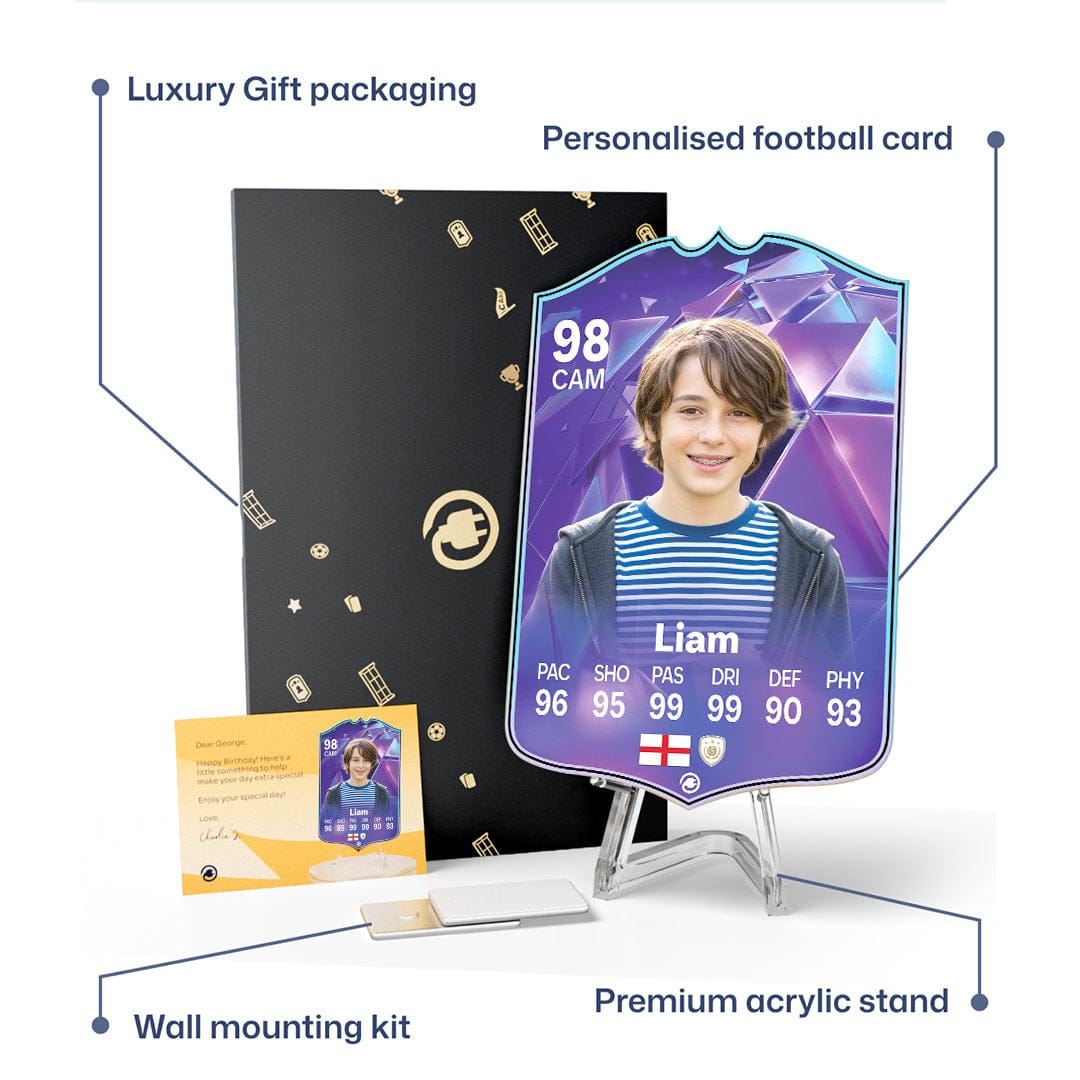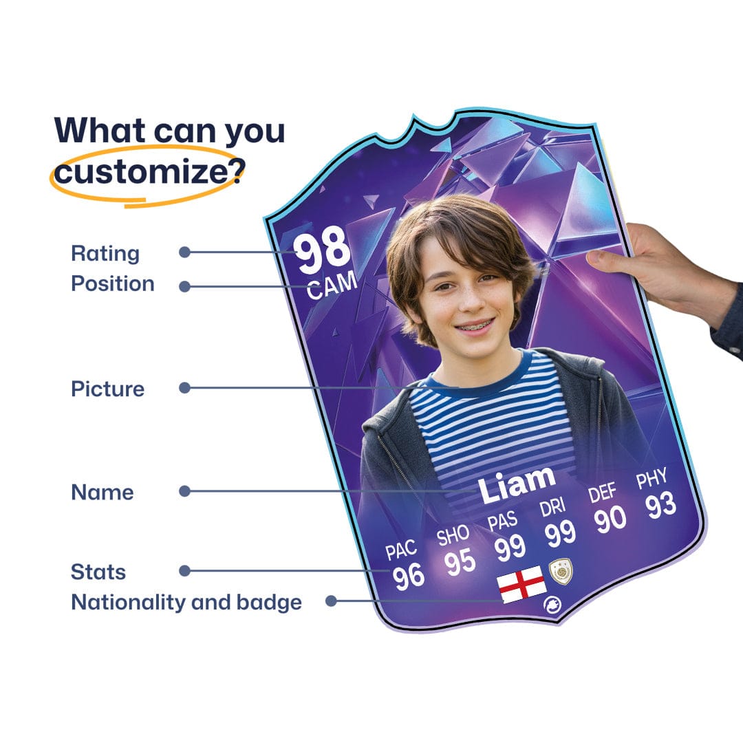 When it comes to personalising your card, the basic steps are to upload a photo and add a name to your card. Then you’ll add details like your player’s position and skill ratings out of 99 for each football skill shown on the card. Our online card builder makes this really easy. And if you aren’t a football card expert, don’t worry!